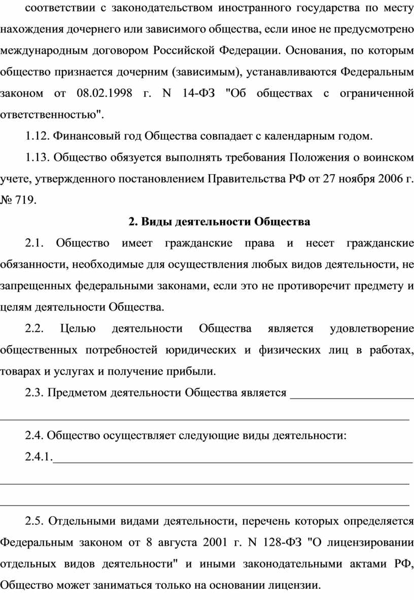 1.11. Зависимые и дочерние общества на территории Российской Федерации создаются в соответствии с законодательством Российской Федерации, а за пределами территории Российской Федерации - в соответствии с законодательством иностранного государства по месту нахождения дочернего или зависимого общества, если иное не предусмотрено международным договором Российской Федерации. Основания, по которым общество признается дочерним (зависимым), устанавливаются Федеральным законом от 08.02.1998 г. N 14-ФЗ "Об обществах с ограниченной ответственностью".