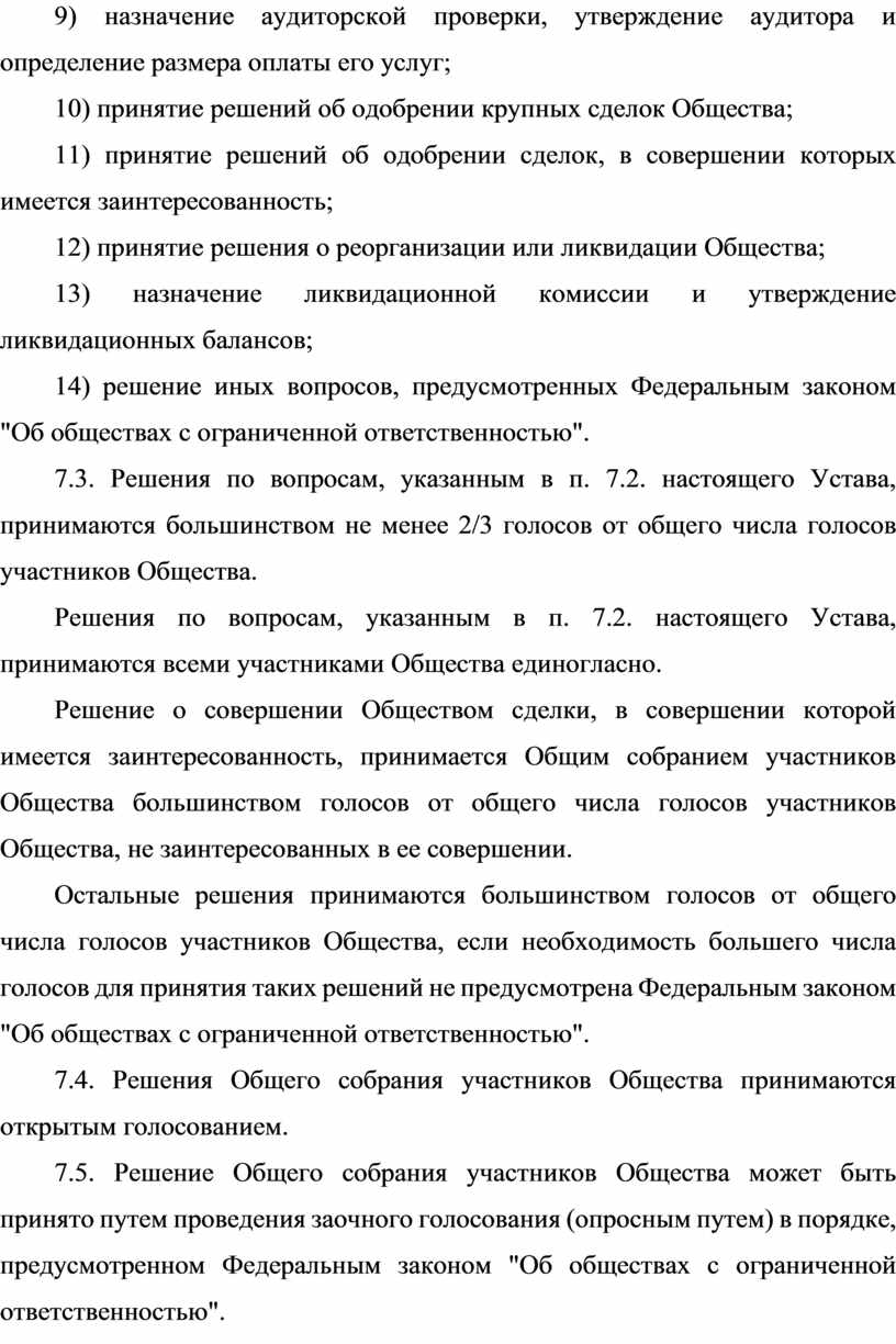 7.3. Решения по вопросам, указанным в п. 7.2. настоящего Устава, принимаются большинством не менее 2/3 голосов от общего числа голосов участников Общества.
