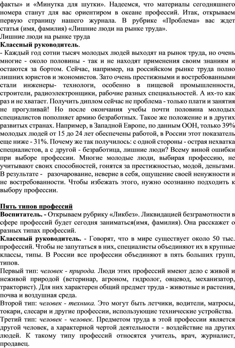 Вас ждут такие рубрики: «Проблема», «Лента новостей», «Ликбез» (ликвидация безграмотности), «Криминал», «Тесты», «Занимательные факты» и «Минутка для шутки». Надеемся, что материалы сегодняшнего номера станут для вас ориентиром в океане профессий. Итак, открываем первую страницу нашего журнала. В рубрике «Проблема» вас ждет статья (имя, фамилия) «Лишние люди на рынке труда».
