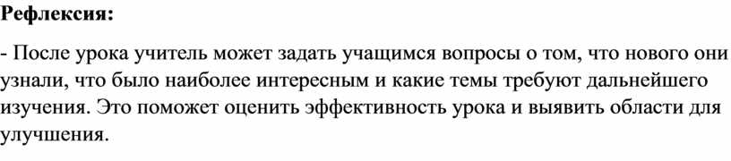 - После урока учитель может задать учащимся вопросы о том, что нового они узнали, что было наиболее интересным и какие темы требуют дальнейшего изучения. Это поможет оценить эффективность урока и выявить области для улучшения.