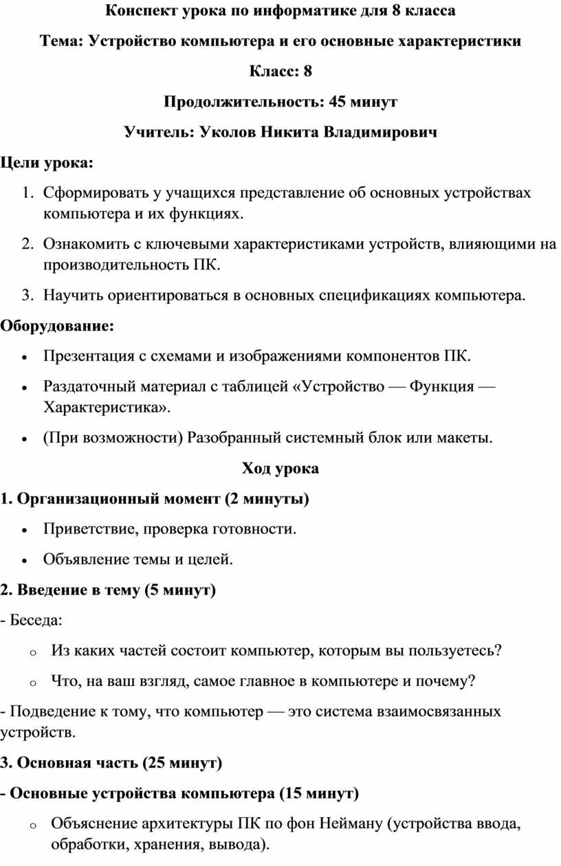 Тема: Устройство компьютера и его основные характеристики