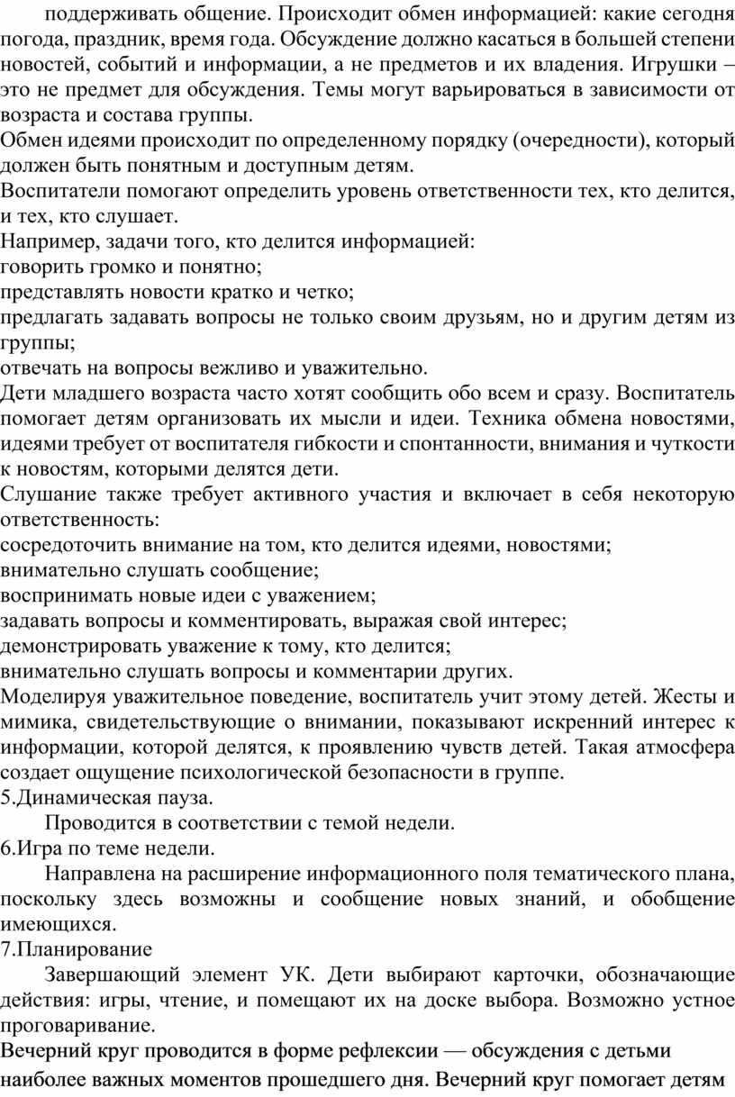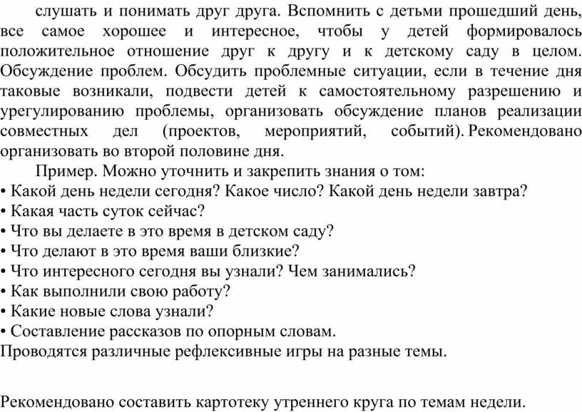 Вечерний круг проводится в форме рефлексии — обсуждения с детьми наиболее важных моментов прошедшего дня. Вечерний круг помогает детям научиться осознавать и анализировать свои поступки и поступки сверстников. Дети учатся справедливости, взаимному уважению, умению слушать и понимать друг друга. Вспомнить с детьми прошедший день, все самое хорошее и интересное, чтобы у детей формировалось положительное отношение друг к другу и к детскому саду в целом. Обсуждение проблем. Обсудить проблемные ситуации, если в течение дня таковые возникали, подвести детей к самостоятельному разрешению и урегулированию проблемы, организовать обсуждение планов реализации совместных дел (проектов, мероприятий, событий). Рекомендовано организовать во второй половине дня.