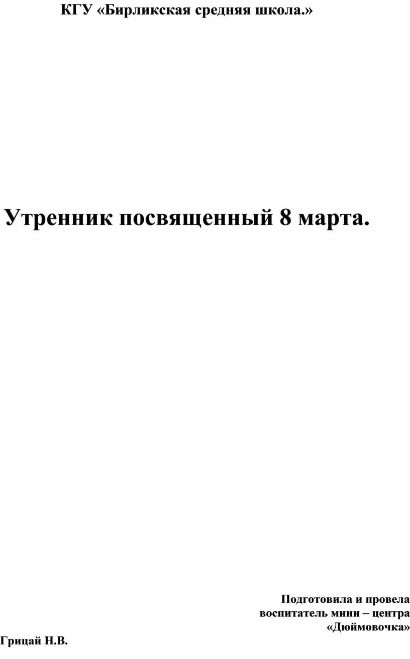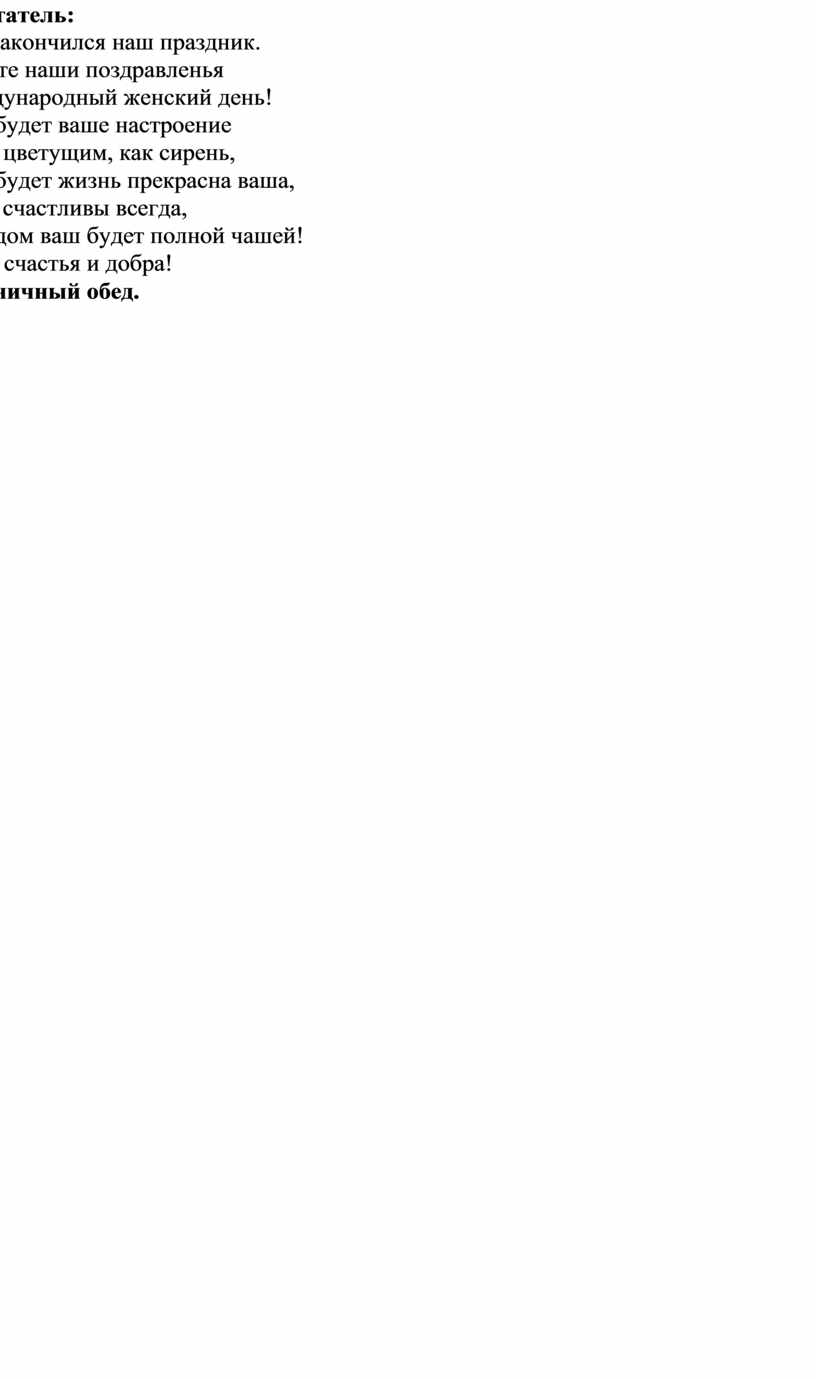 Воспитатель: Здравствуйте, гости дорогие! Сегодня мы отмечаем женский праздник 8 Марта. Праздник весны, нежности и доброты. Желаем всем счастья, здоровья, успехов в воспитании своих ребятишек!
