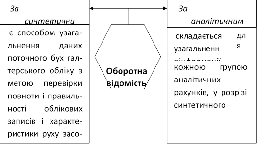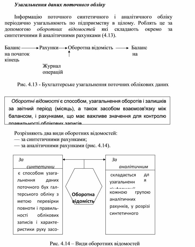 Інформацію поточного синтетичного і аналітичного обліку періодично узагальнюють по підприємству в цілому. Роблять це за допомогою оборотних відомостей які складають окремо за синтетичними й аналітичними рахунками (4.13).