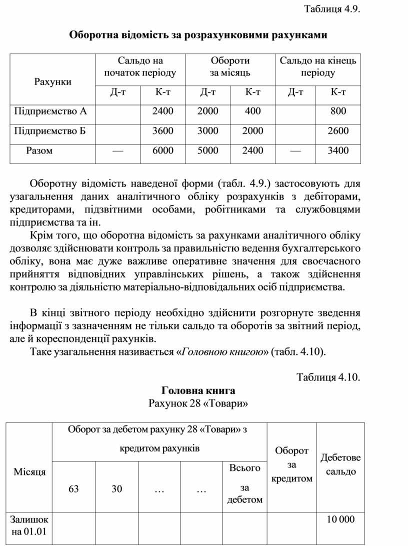 Оборотну відомість наведеної форми (табл. 4.9.) застосовують для узагальнення даних аналітичного обліку розрахунків з дебіторами, кредиторами, підзвітними особами, робітниками та службовцями підприємства та ін.