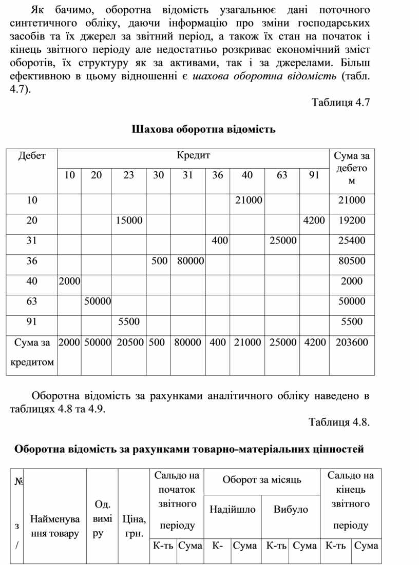 Як бачимо, оборотна відомість узагальнює дані поточного синтетичного обліку, даючи інформацію про зміни господарських засобів та їх джерел за звітний період, а також їх стан на початок і кінець звітного періоду але недостатньо розкриває економічний зміст оборотів, їх структуру як за активами, так і за джерелами. Більш ефективною в цьому відношенні є шахова оборотна відомість (табл. 4.7).