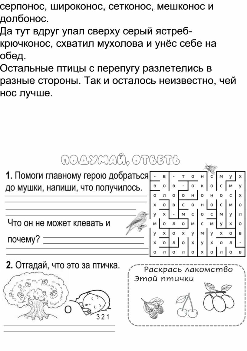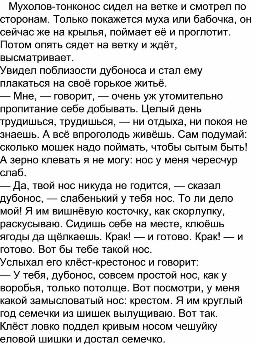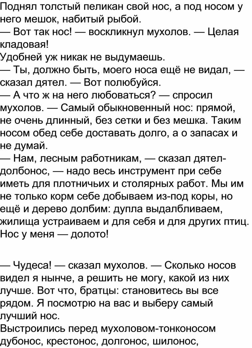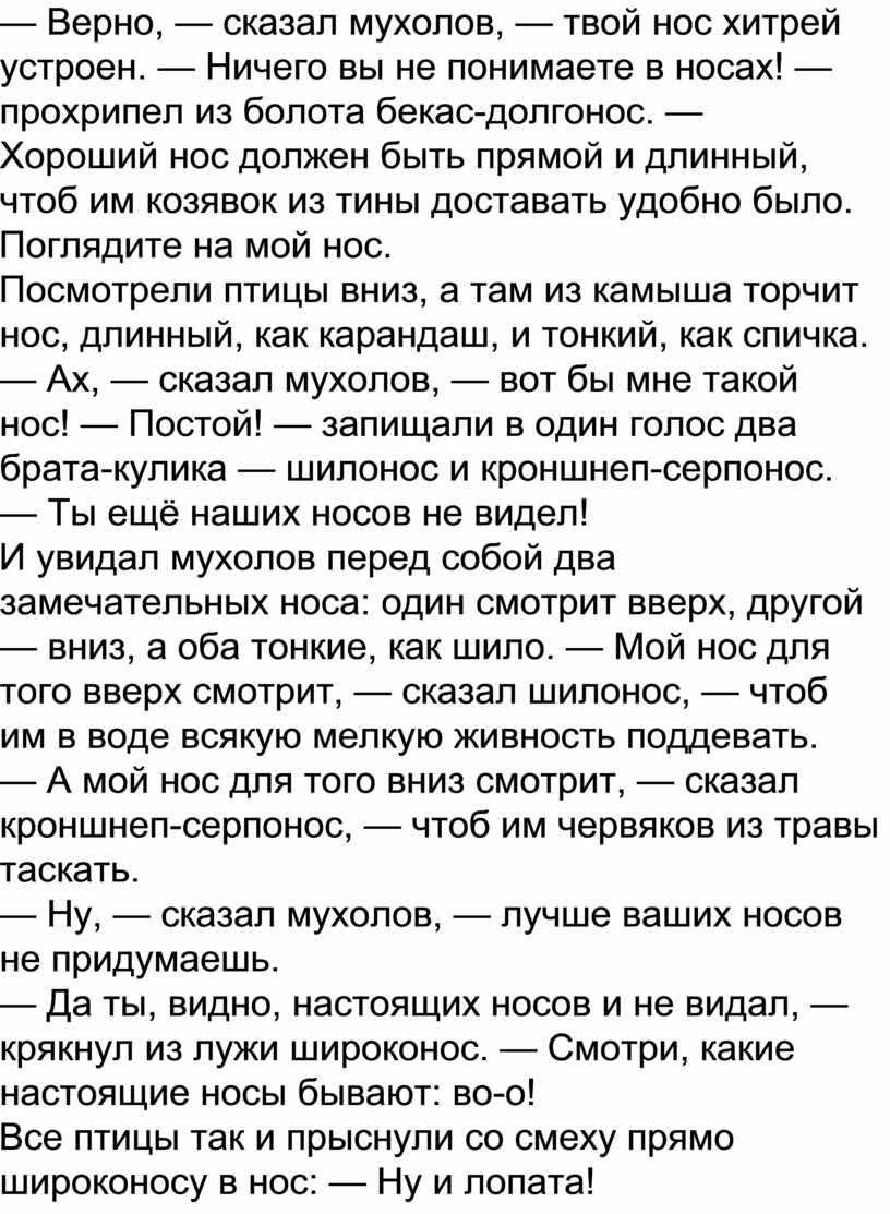 — Ах, — сказал мухолов, — вот бы мне такой нос! — Постой! — запищали в один голос два брата-кулика — шилонос и кроншнеп-серпонос. — Ты ещё наших носов не видел!