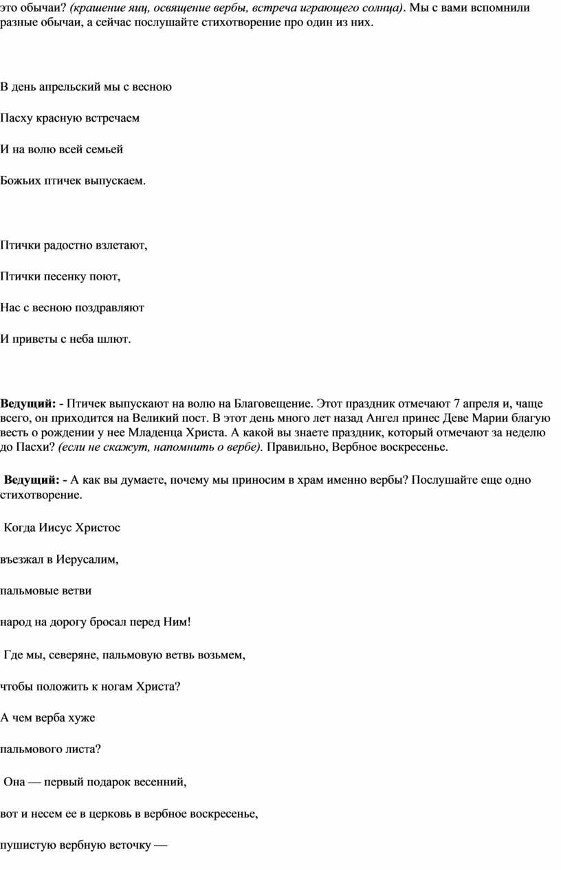 Ведущий: - Птичек выпускают на волю на Благовещение. Этот праздник отмечают 7 апреля и, чаще всего, он приходится на Великий пост. В этот день много лет назад Ангел принес Деве Марии благую весть о рождении у нее Младенца Христа. А какой вы знаете праздник, который отмечают за неделю до Пасхи? (если не скажут, напомнить о вербе). Правильно, Вербное воскресенье.