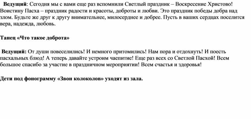 Ведущий: Сегодня мы с вами еще раз вспомнили Светлый праздник – Воскресение Христово! Воистину Пасха – праздник радости и красоты, доброты и любви. Это праздник победы добра над злом. Будьте же друг к другу внимательнее, милосерднее и добрее. Пусть в ваших сердцах поселится вера, надежда, любовь.