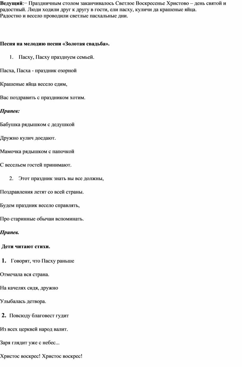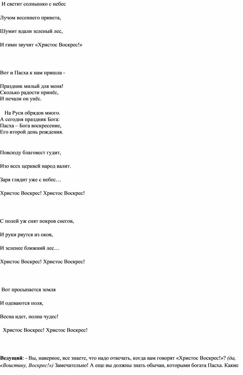 Ведущий: - Вы, наверное, все знаете, что надо отвечать, когда вам говорят «Христос Воскрес!»? (да, «Воистину, Воскрес!») Замечательно! А еще вы должны знать обычаи, которыми богата Пасха. Какие это обычаи? (крашение яиц, освящение вербы, встреча играющего солнца). Мы с вами вспомнили разные обычаи, а сейчас послушайте стихотворение про один из них.
