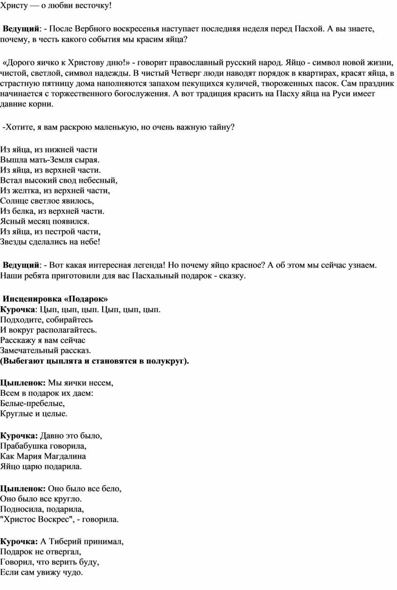 Ведущий: - Вот какая интересная легенда! Но почему яйцо красное? А об этом мы сейчас узнаем. Наши ребята приготовили для вас Пасхальный подарок - сказку.