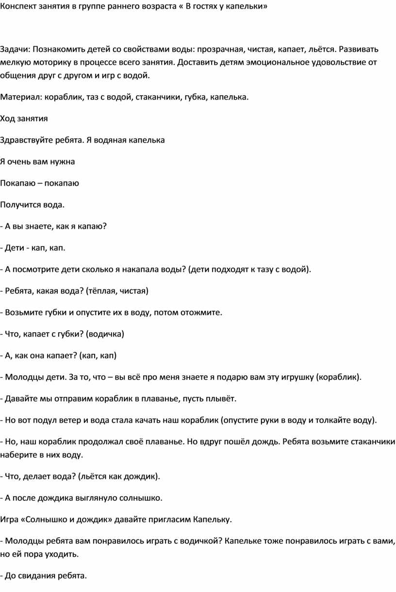 Конспект занятия в группе раннего возраста « В гостях у капельки»