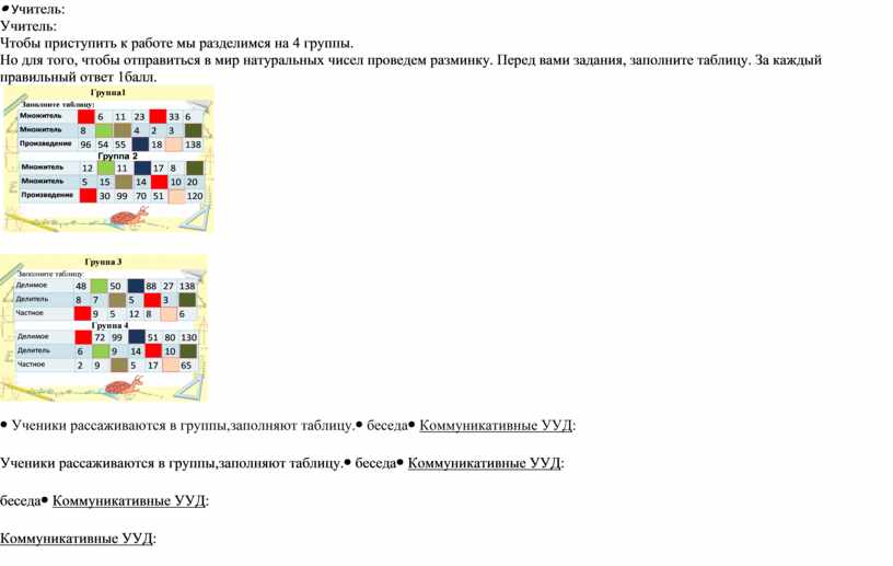Учитель: Чтобы приступить к работе мы разделимся на 4 группы. Но для того, чтобы отправиться в мир натуральных чисел проведем разминку. Перед вами задания, заполните таблицу. За каждый правильный ответ 1балл.