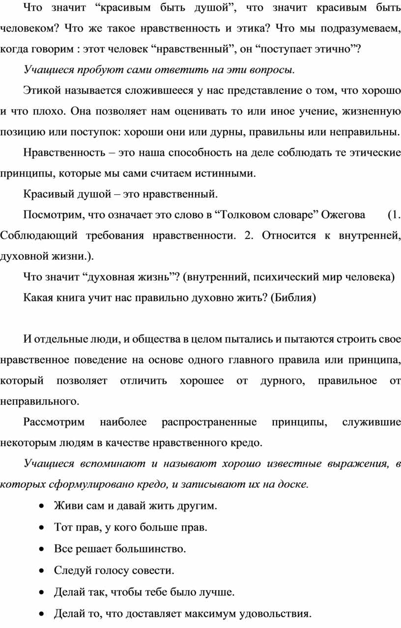 Что значит “красивым быть душой”, что значит красивым быть человеком? Что же такое нравственность и этика? Что мы подразумеваем, когда говорим : этот человек “нравственный”, он “поступает этично”?