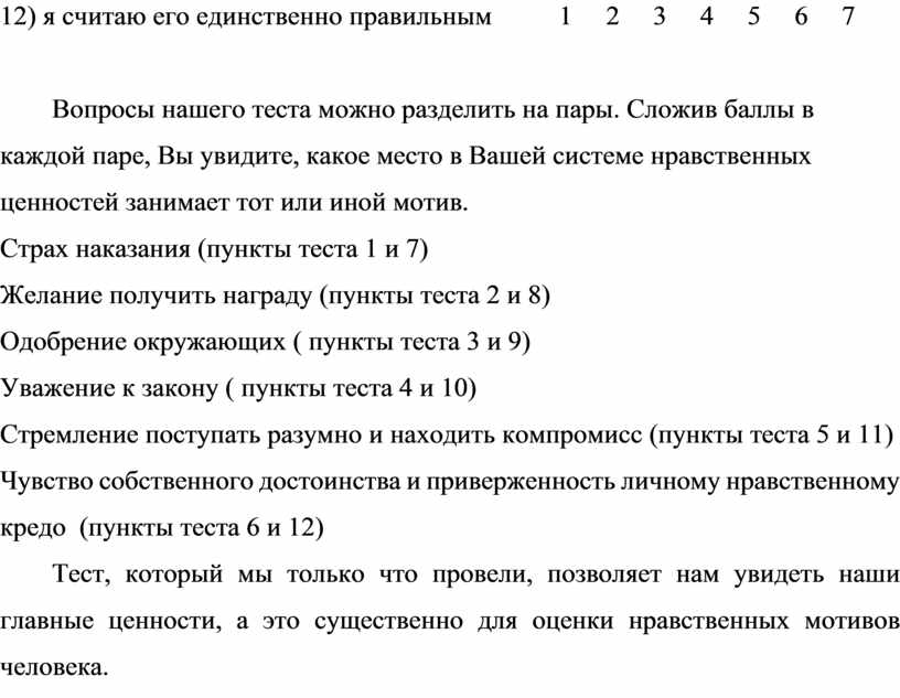 Сейчас мы попробуем выяснить, хотя бы отчасти, те мотивы, которые определяют наш собственный нравственный выбор. Для этого проведем тест. Вам будут предложены 12 утверждений. Ваша задача – указать, в какой мере каждое из них соответствует Вашему поведению. Оцените для себя истинность каждого из этих утверждений по семибалльной шкале.