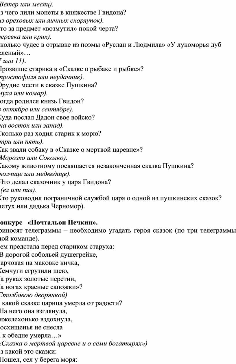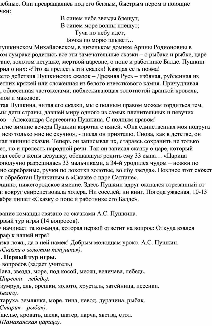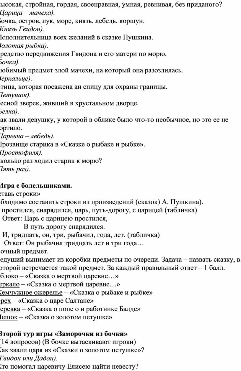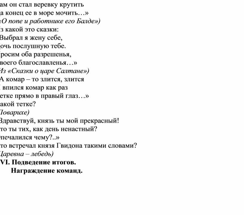 (Необходимо составить строки из произведений (сказок) А. Пушкина).
