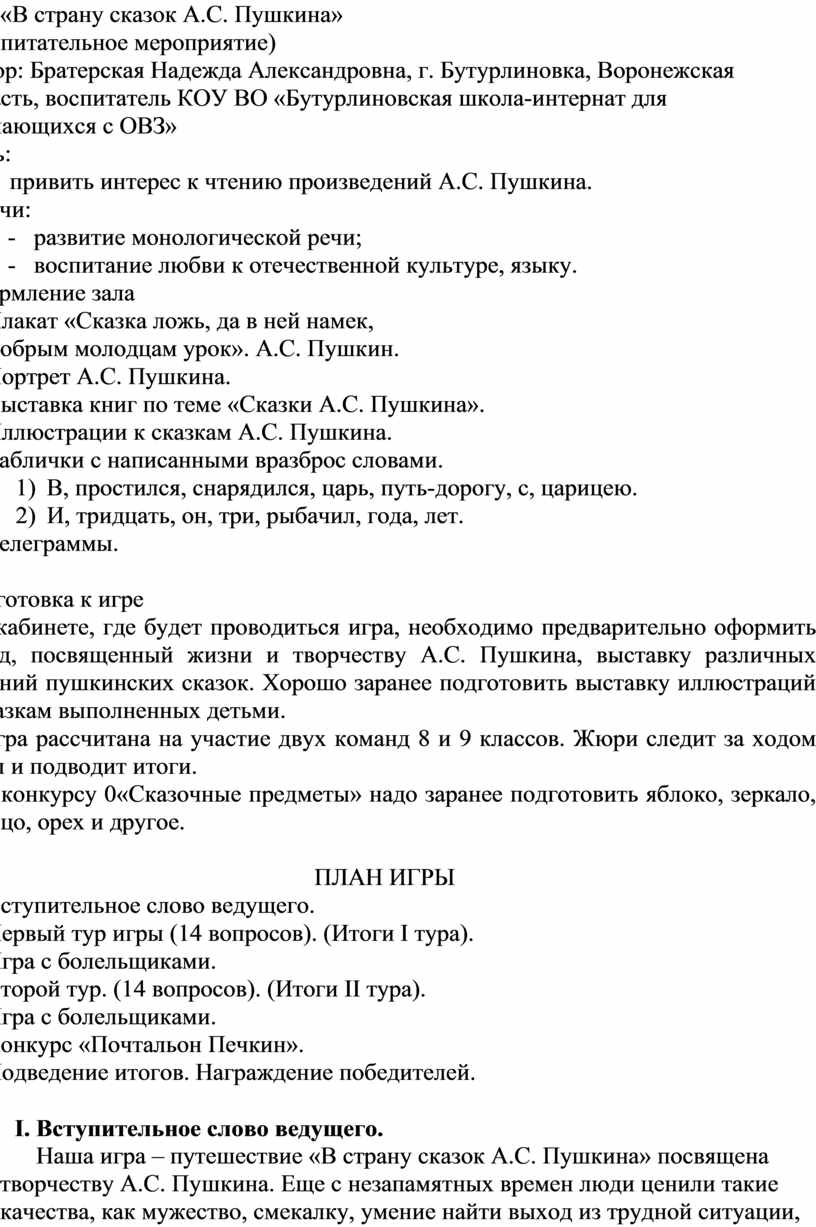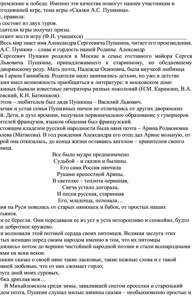 Наша игра – путешествие «В страну сказок А.С. Пушкина» посвящена творчеству А.С. Пушкина. Еще с незапамятных времен люди ценили такие качества, как мужество, смекалку, умение найти выход из трудной ситуации, стремление к победе. Именно эти качества помогут нашим участникам в сегодняшней игре, тема игры «Сказки А.С. Пушкина».