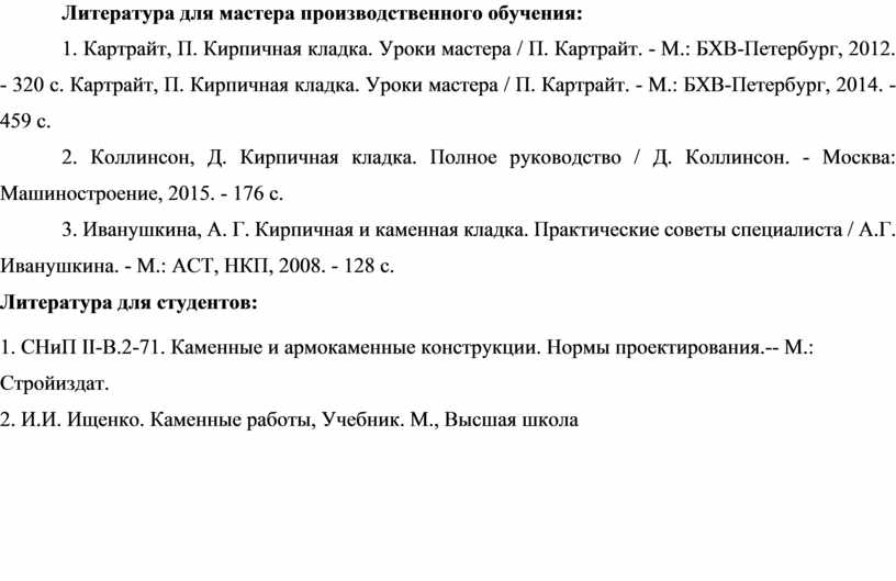1. Картрайт, П. Кирпичная кладка. Уроки мастера / П. Картрайт. - М.: БХВ-Петербург, 2012. - 320 c. Картрайт, П. Кирпичная кладка. Уроки мастера / П. Картрайт. - М.: БХВ-Петербург, 2014. - 459 c.