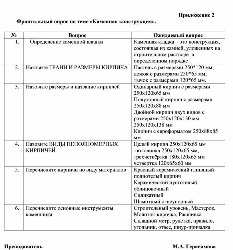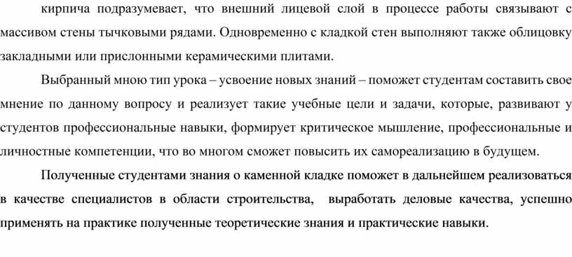 Полученные студентами знания о каменной кладке поможет в дальнейшем реализоваться в качестве специалистов в области строительства, выработать деловые качества, успешно применять на практике полученные теоретические знания и практические навыки.