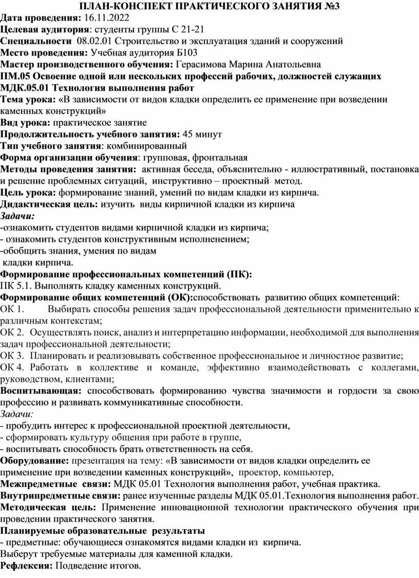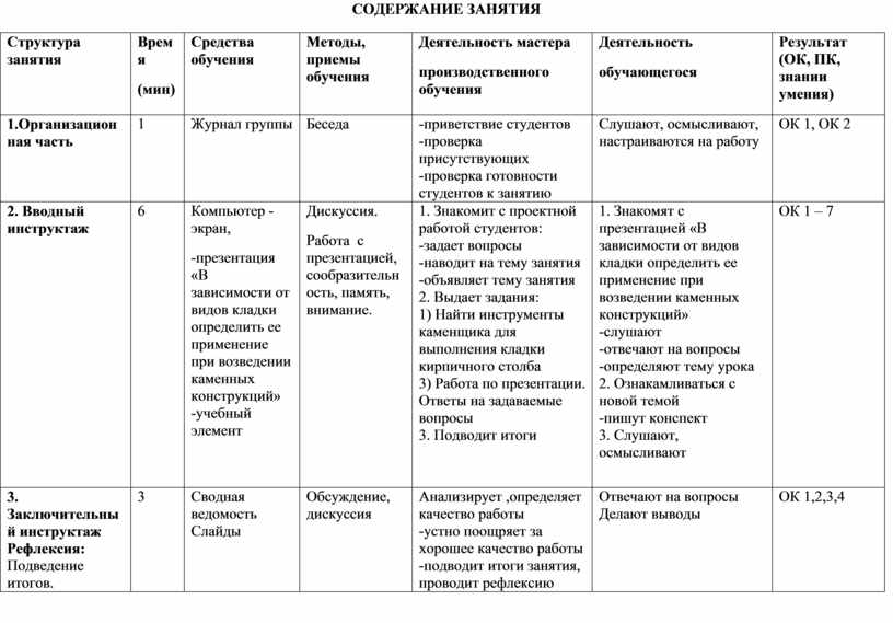 - предметные: обучающиеся ознакомятся видами кладки из кирпича.
