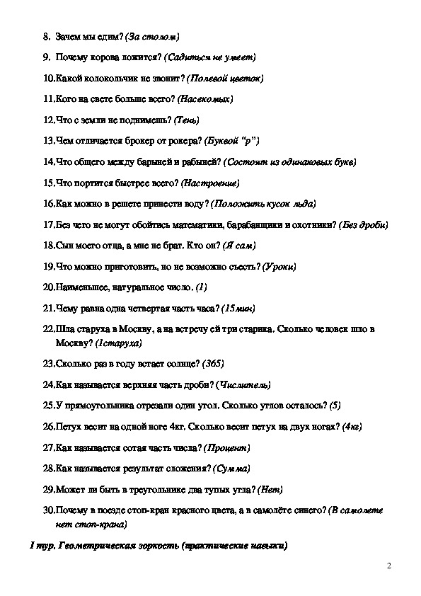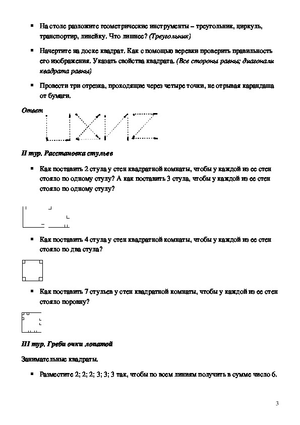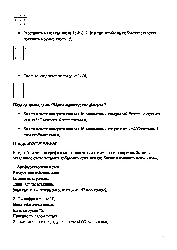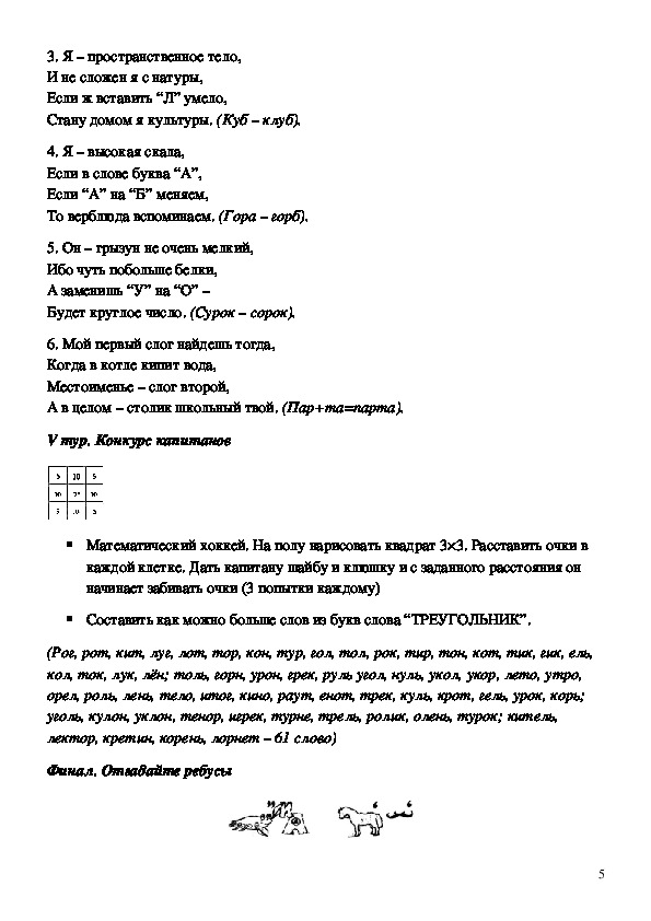 Оборудование: 2 веревки; геометрические инструменты; для фокусов (2 бумажных квадрата), ребусы; ножницы; призы и грамоты.Правила туров и финала