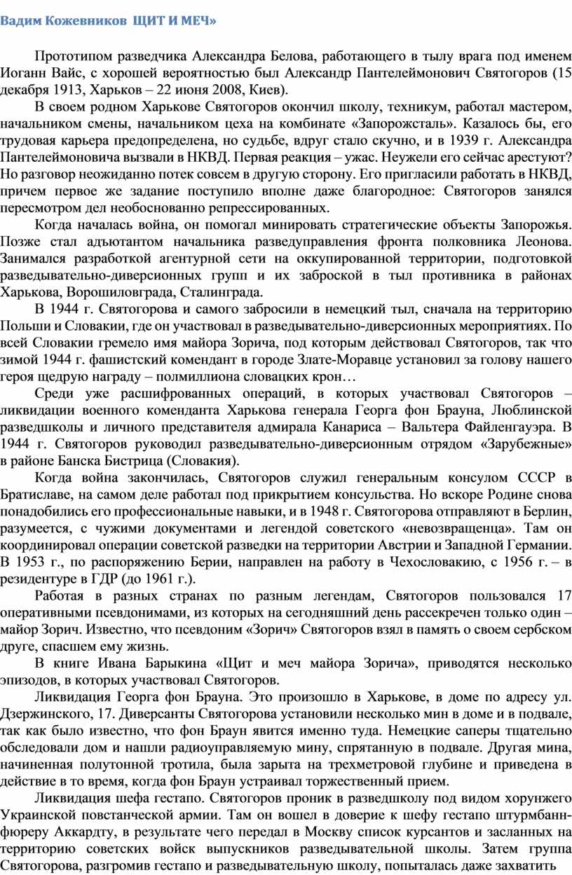 В книге Ивана Барыкина «Щит и меч майора Зорича», приводятся несколько эпизодов, в которых участвовал Святогоров.
