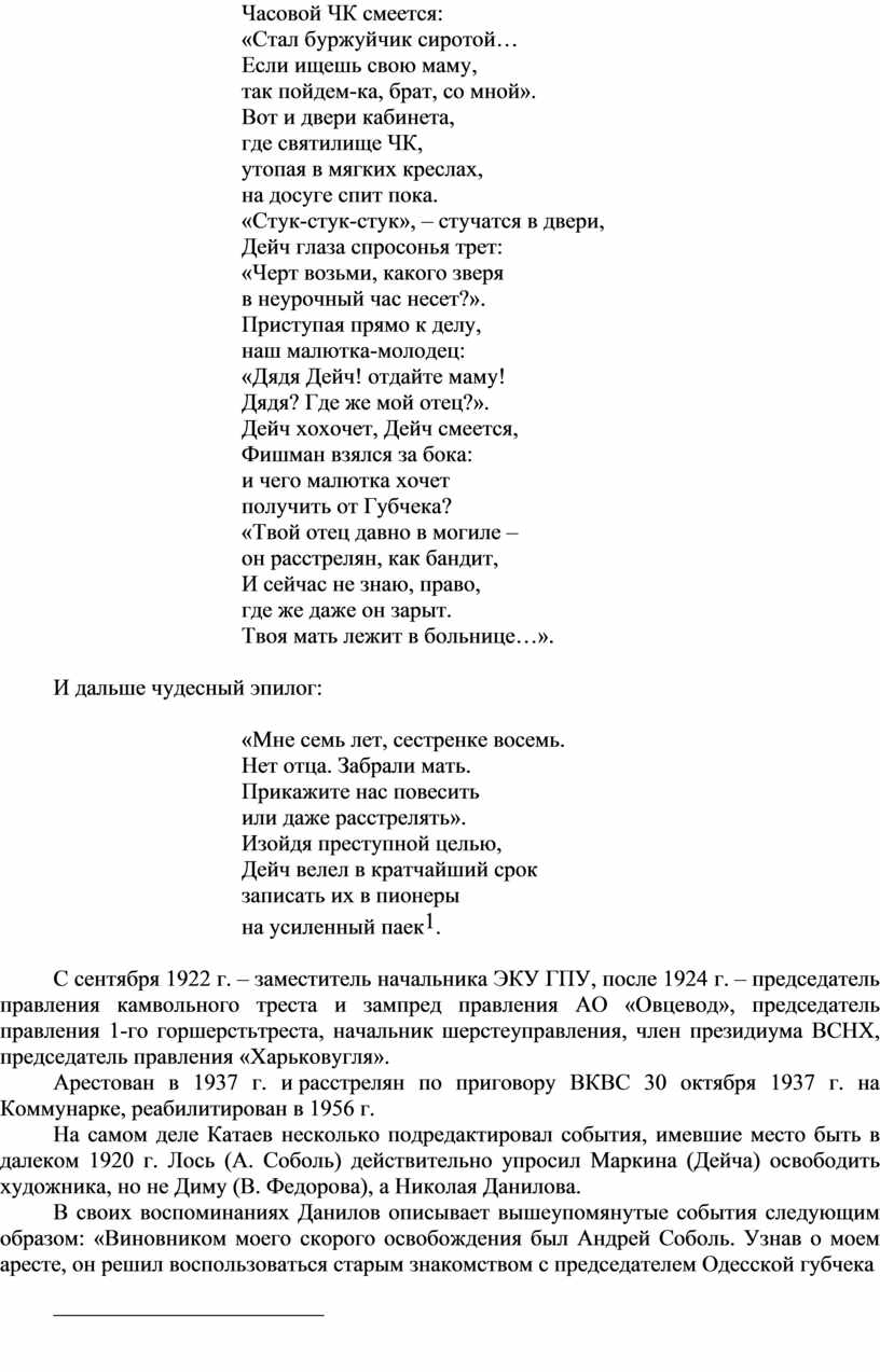 На самом деле Катаев несколько подредактировал события, имевшие место быть в далеком 1920 г. Лось (А. Соболь) действительно упросил Маркина (Дейча) освободить художника, но не Диму (В. Федорова), а Николая Данилова.