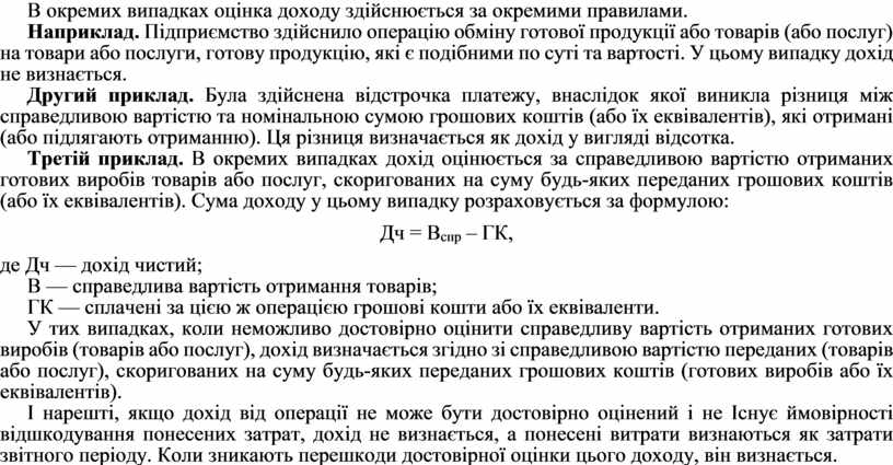 У тих випадках, коли неможливо достовірно оцінити справедливу вартість отриманих готових виробів (товарів або послуг), дохід визначається згідно зі справедливою вартістю переданих (товарів або послуг), скоригованих на суму будь-яких переданих грошових коштів (готових виробів або їх еквівалентів).