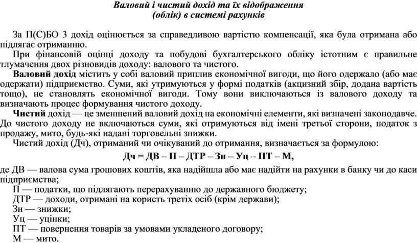При фінансовій оцінці доходу та побудові бухгалтерського обліку істотним є правильне тлумачення двох різновидів доходу: валового та чистого.
