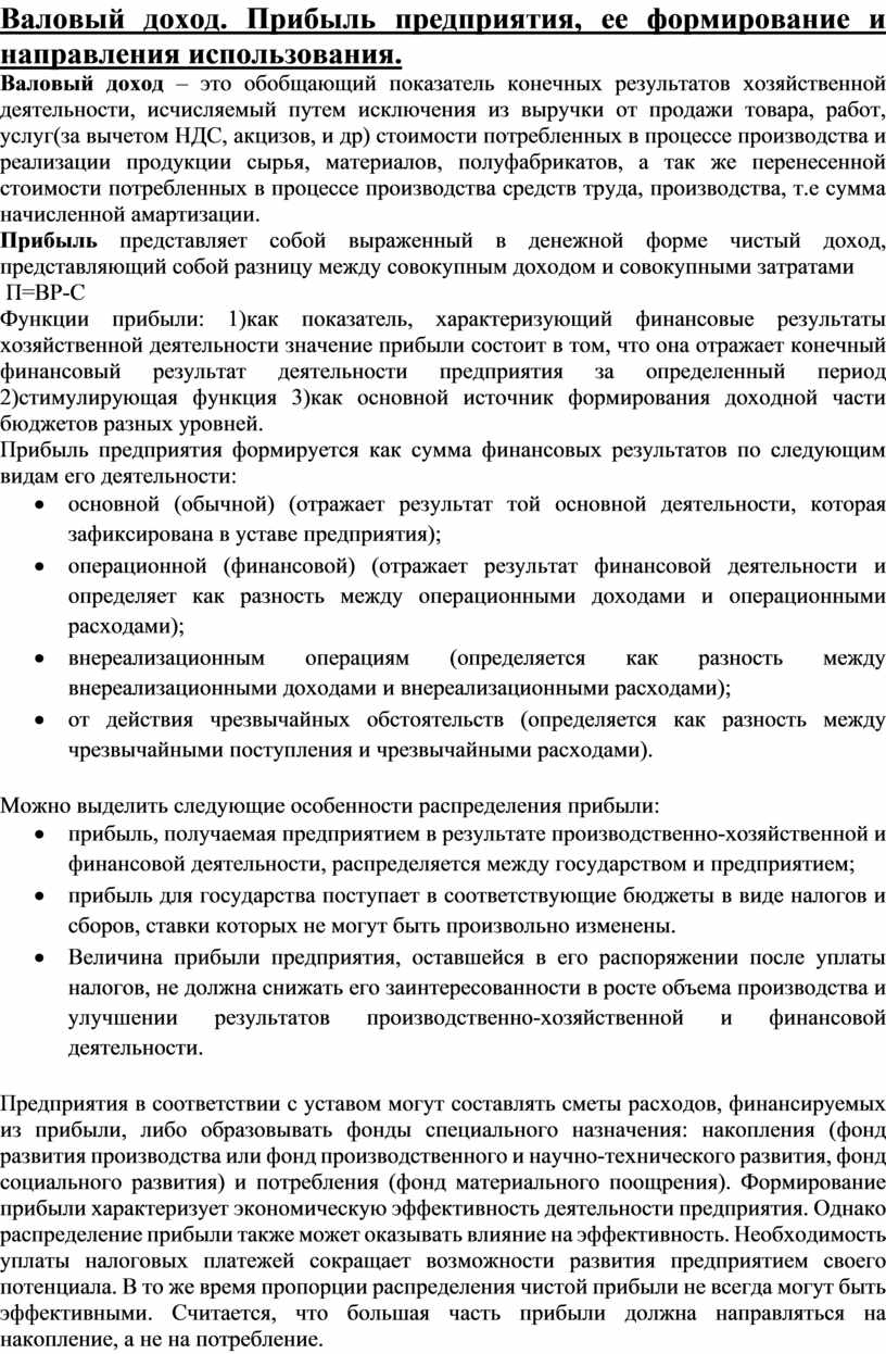 Валовый доход. Прибыль предприятия, ее формирование и направления использования.