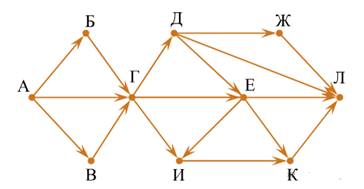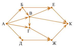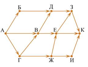 На рисунке — схема дорог, связывающих города А, Б, В, Г, Д, Е и К. По каждой дороге можно двигаться только в одном направлении, указанном стрелкой. Сколько существует различных путей из города А в город К?