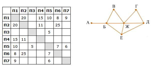 На рисунке справа схема дорог Н-ского района изображена в виде графа; в таблице слева содержатся сведения о протяжённости каждой из этих дорог (в километрах).