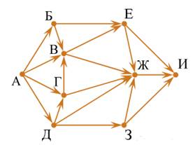 На рисунке — схема дорог, связывающих города А, Б, В, Г, Д, Е, Ж, З и И. По каждой дороге можно двигаться только в одном направлении, указанном стрелкой. Сколько существует различных путей из города А в город И, проходящих через город В?