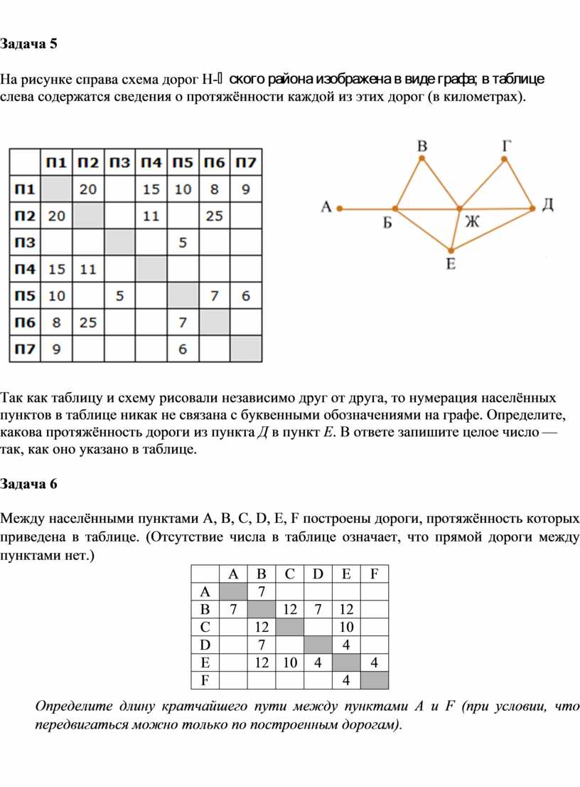 Так как таблицу и схему рисовали независимо друг от друга, то нумерация населённых пунктов в таблице никак не связана с буквенными обозначениями на графе. Определите, какова протяжённость дороги из пункта Д в пункт Е. В ответе запишите целое число — так, как оно указано в таблице.