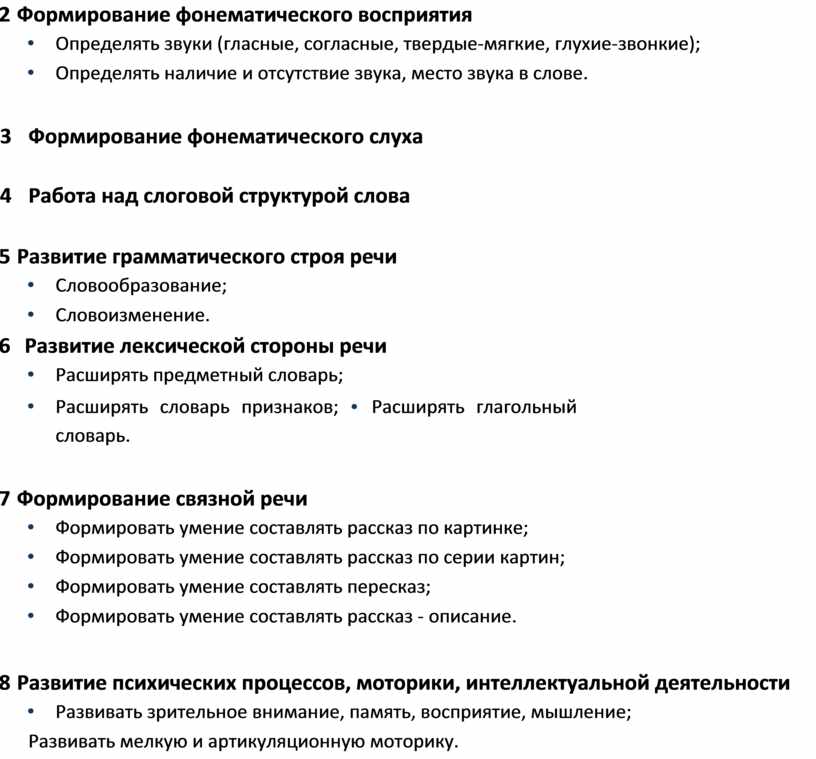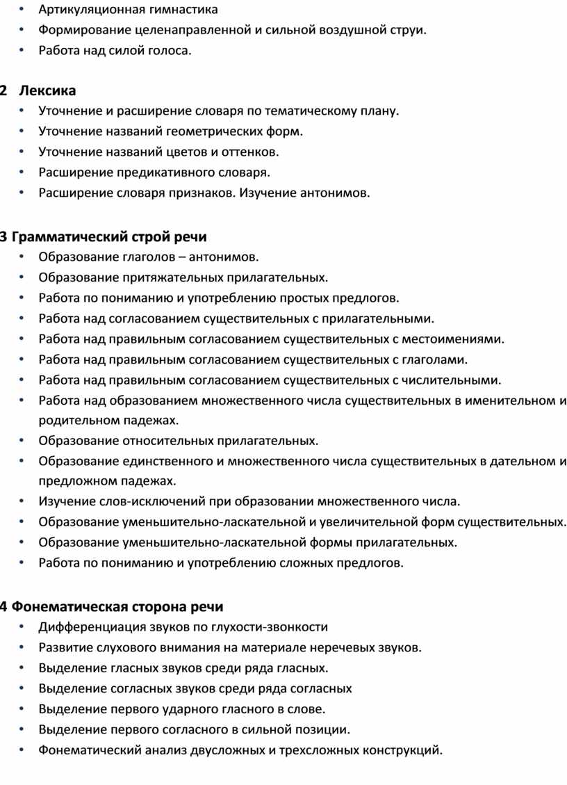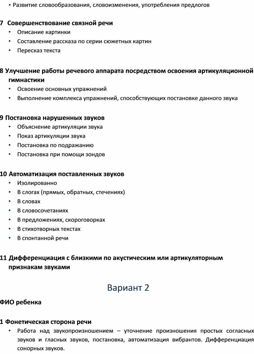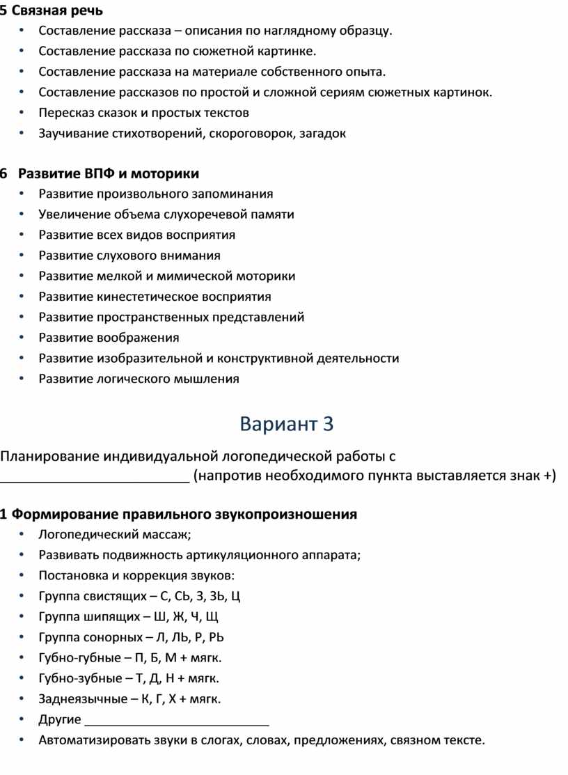 Планирование индивидуальной логопедической работы c ________________________ (напротив необходимого пункта выставляется знак +)