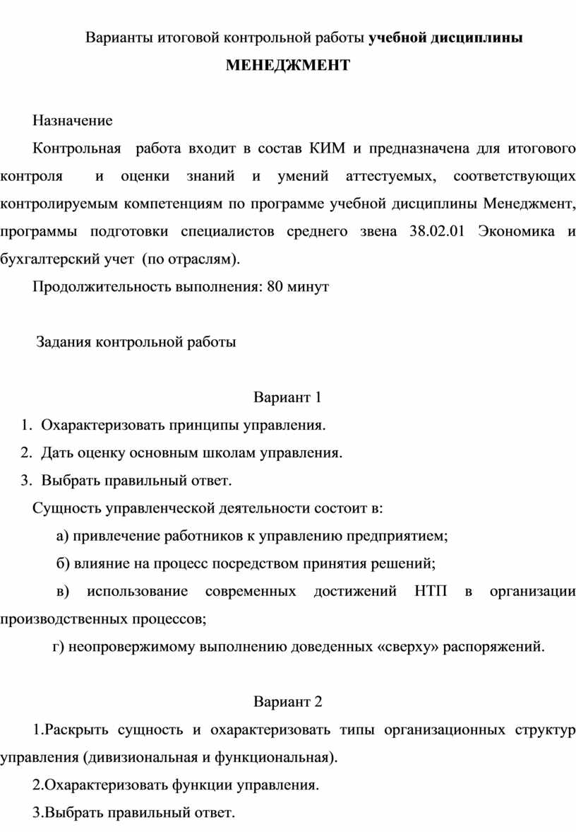 Контрольная работа входит в состав КИМ и предназначена для итогового контроля и оценки знаний и умений аттестуемых, соответствующих контролируемым компетенциям по программе учебной дисциплины Менеджмент, программы подготовки специалистов среднего звена 38.02.01 Экономика и бухгалтерский учет (по отраслям).