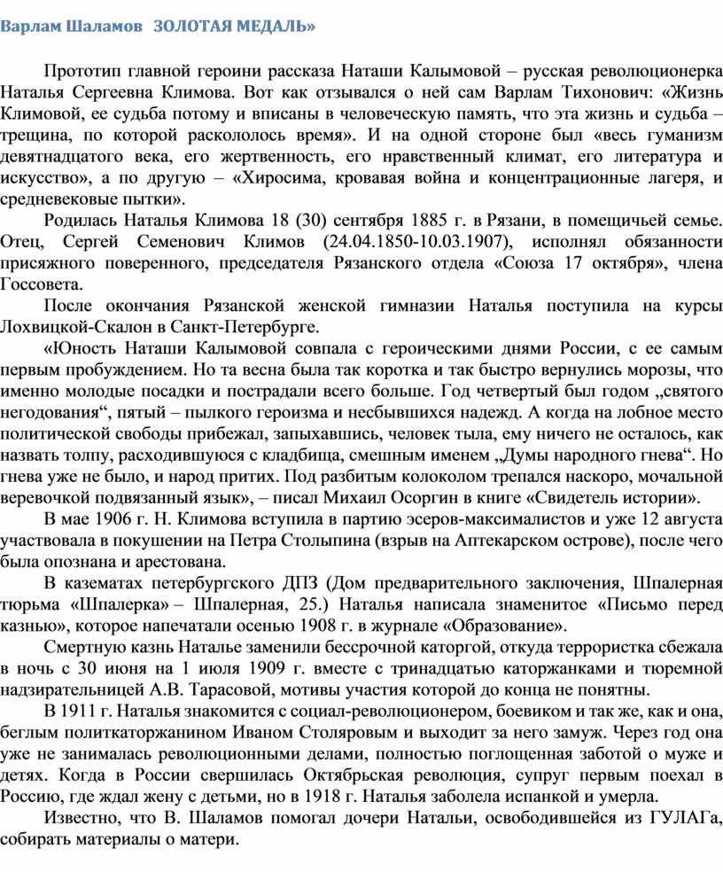 Прототип главной героини рассказа Наташи Калымовой – русская революционерка Наталья Сергеевна Климова. Вот как отзывался о ней сам Варлам Тихонович: «Жизнь Климовой, ее судьба потому и вписаны в человеческую память, что эта жизнь и судьба – трещина, по которой раскололось время». И на одной стороне был «весь гуманизм девятнадцатого века, его жертвенность, его нравственный климат, его литература и искусство», а по другую – «Хиросима, кровавая война и концентрационные лагеря, и средневековые пытки».