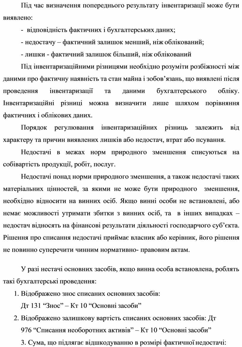 Недостачі понад норми природного зменшення, а також недостачі таких матеріальних цінностей, за якими не може бути природного зменшення, необхідно відносити на винних осіб. Якщо винні особи не встановлені, або немає можливості утримати збитки з винних осіб, та в інших випадках – недостач відносять на фінансові результати діяльності господарчого суб’єкта. Рішення про списання недостачі приймає власник або керівник, його рішення не повинно суперечити чинним нормативно- правовим актам.