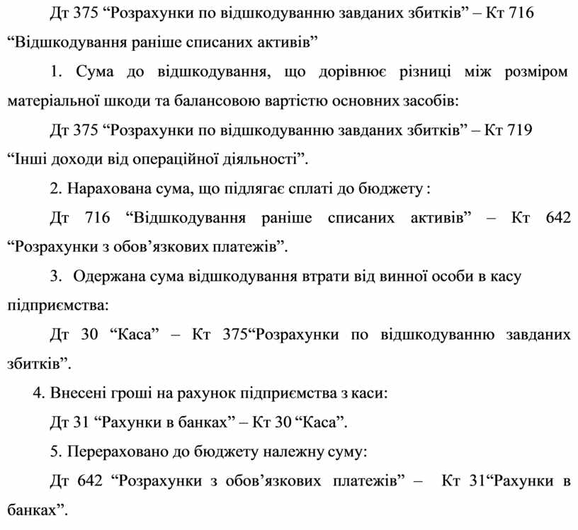 Дт 375 “Розрахунки по відшкодуванню завданих збитків” – Кт 716 “Відшкодування раніше списаних активів”
