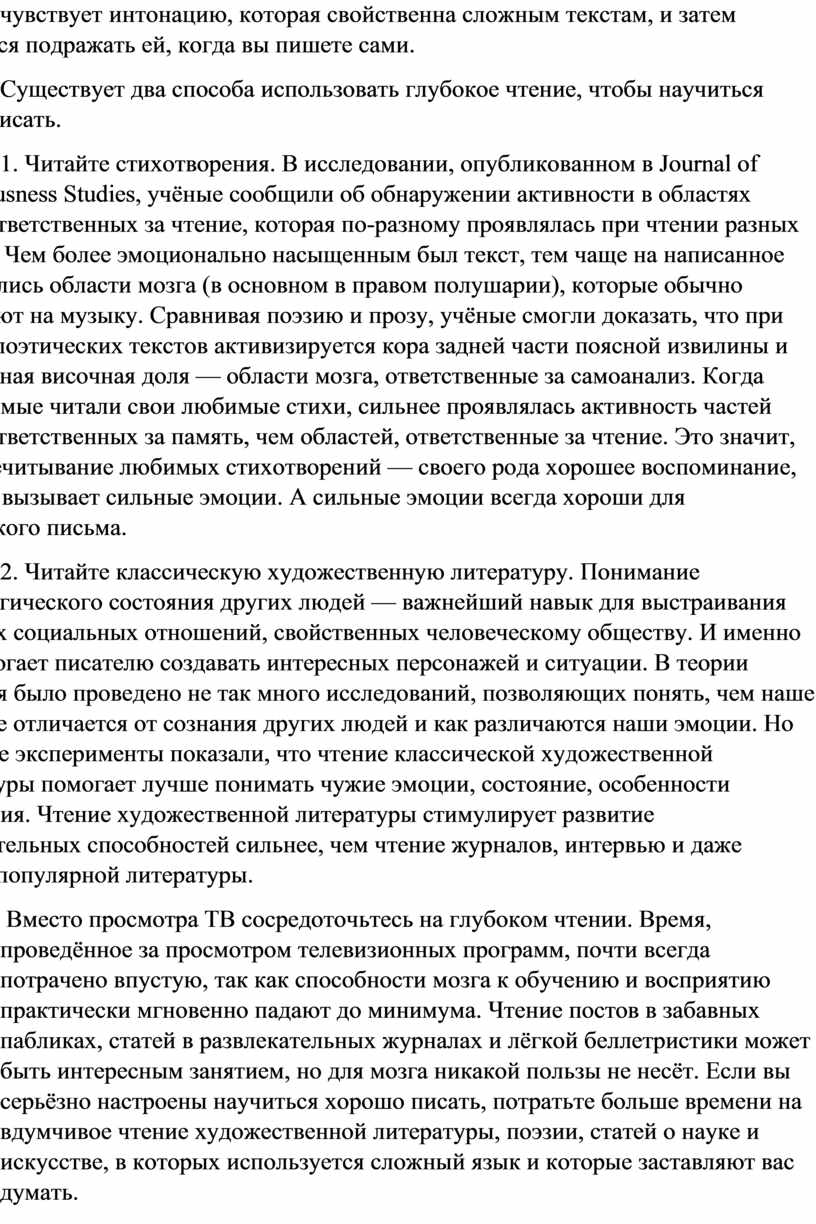 Разница между глубоким и поверхностным чтением. Глубокое чтение — это медленное, вдумчивое чтение текстов со сложными моральными вопросами, которое отличается от поверхностного чтения не только узнаванием новых слов. Глубокое чтение возможно, только если у вас есть текст, в котором много деталей, аллюзий, метафор. Тогда в мозге читающего активируются те же области, которые задействованы при переживании нового опыта. Кроме того, глубокое чтение способствует увеличению эмпатии, умению сопереживать. Читатель, глубже погружаясь в прочитанное, начинает рефлексировать, анализировать и примерять прочитанное на себя и свой опыт. Также во время чтения человек подмечает, что именно — авторские приёмы, стилевые особенности, построение сюжета — делает книгу увлекательной и уникальной, а значит, учится писать на более серьёзном уровне. Поверхностное чтение — это тексты, которые вы можете найти в онлайн-блогах или на развлекательных сайтах (особенно статьи со списками и жёлтыми заголовками). Таким текстам не хватает оригинального стиля, собственной точки зрения и анализа, которые могли бы стимулировать мысль. Это лёгкие короткие тексты, по которым вы быстро скользите глазами и забываете через несколько минут. Глубокое чтение синхронизирует работу отделов мозга. Глубокое чтение включает в работу отделы мозга, ответственные за зрение, слух и речь. При чтении и письме активизируются следующие мозговые центры: Центр Брока: позволяет воспринимать ритм и синтаксис, помогает объединять отдельные речевые движения в единый речевой акт. Область Вернике: влияет на восприятие отдельных слов и смысла в общем. Угловая извилина: ответственна за восприятие и использование языка. Эти центры соединены между собой группой волокон, которые, по-видимому, помогают писателю связывать и синхронизировать язык с ритмом. При чтении ваш мозг чувствует интонацию, которая свойственна сложным текстам, и затем стремится подражать ей, когда вы пишете сами.