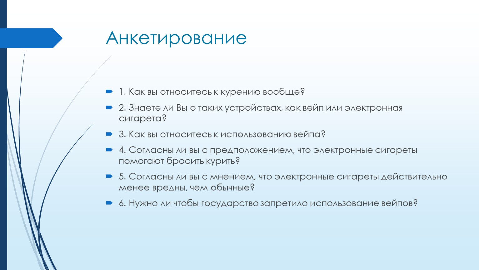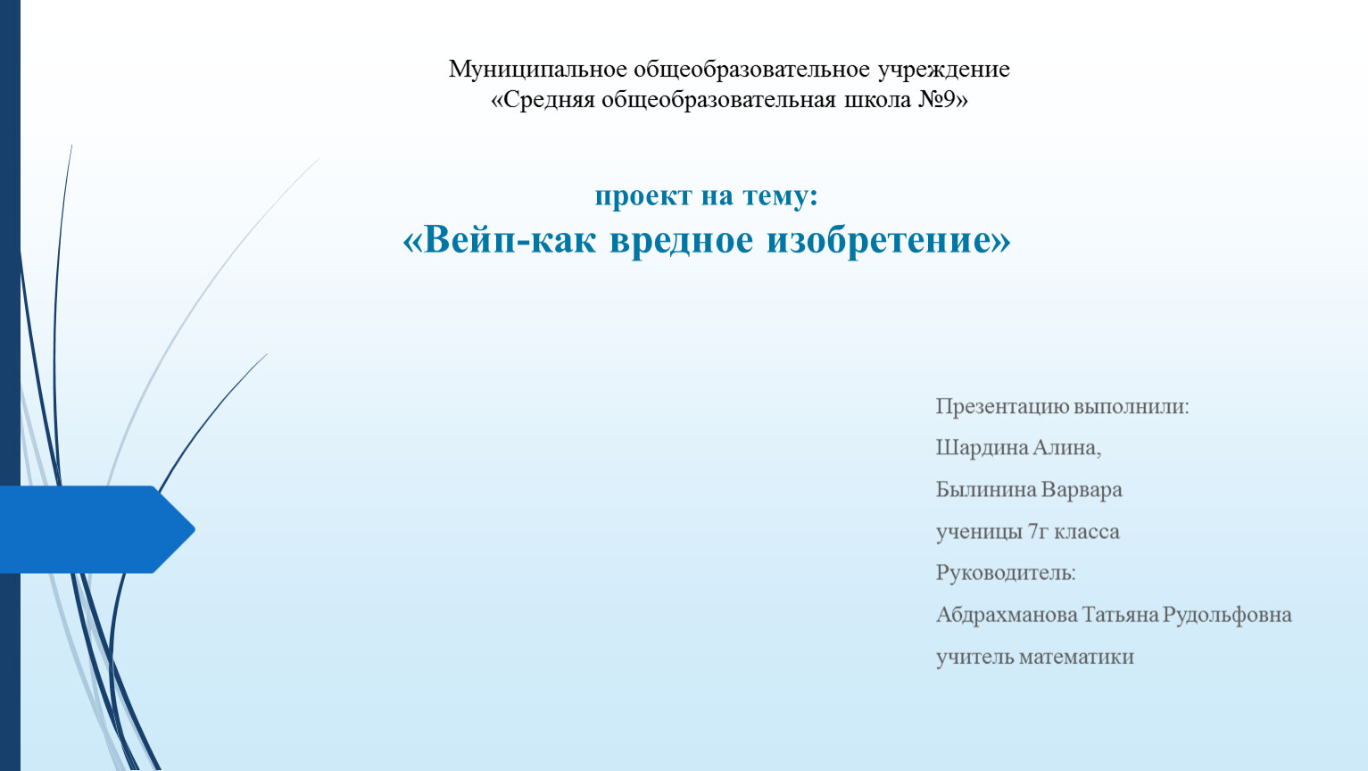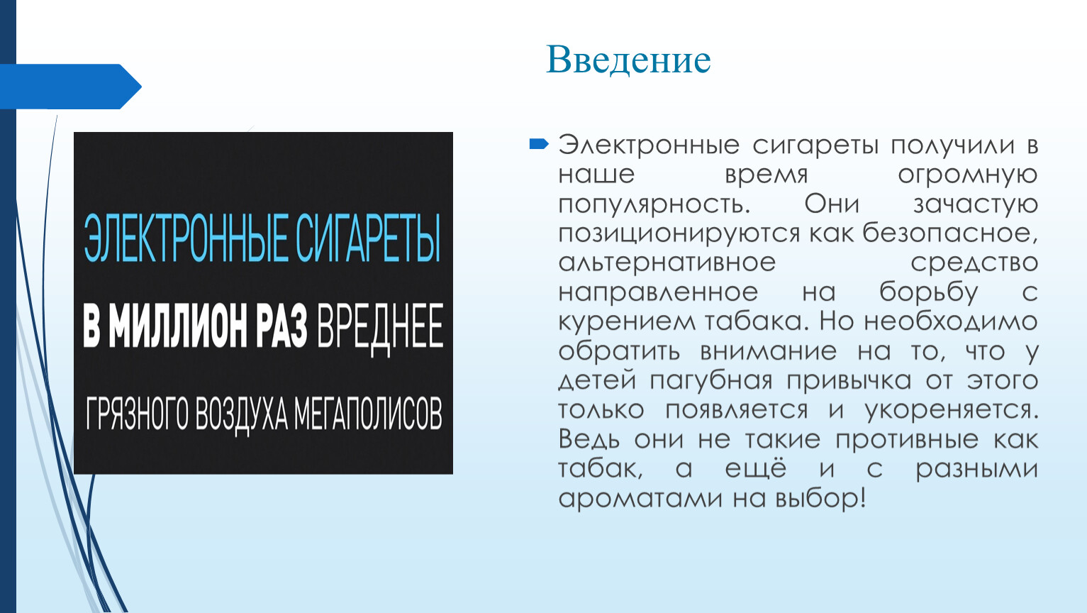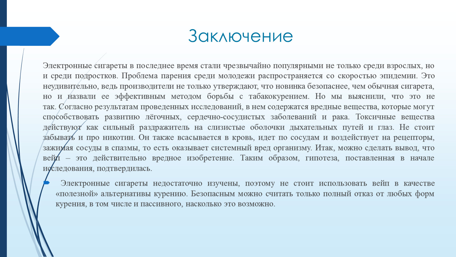 Электронные сигареты в последнее время стали чрезвычайно популярными не только среди взрослых, но и среди подростков. Проблема парения среди молодежи распространяется со скоростью эпидемии. Это неудивительно, ведь производители не только утверждают, что новинка безопаснее, чем обычная сигарета, но и назвали ее эффективным методом борьбы с табакокурением. Но мы выяснили, что это не так. Согласно результатам проведенных исследований, в нем содержатся вредные вещества, которые могут способствовать развитию лёгочных, сердечно-сосудистых заболеваний и рака. Токсичные вещества действуют как сильный раздражитель на слизистые оболочки дыхательных путей и глаз. Не стоит забывать и про никотин. Он также всасывается в кровь, идет по сосудам и воздействует на рецепторы, зажимая сосуды в спазмы, то есть оказывает системный вред организму. Итак, можно сделать вывод, что вейп – это действительно вредное изобретение. Таким образом, гипотеза, поставленная в начале исследования, подтвердилась.