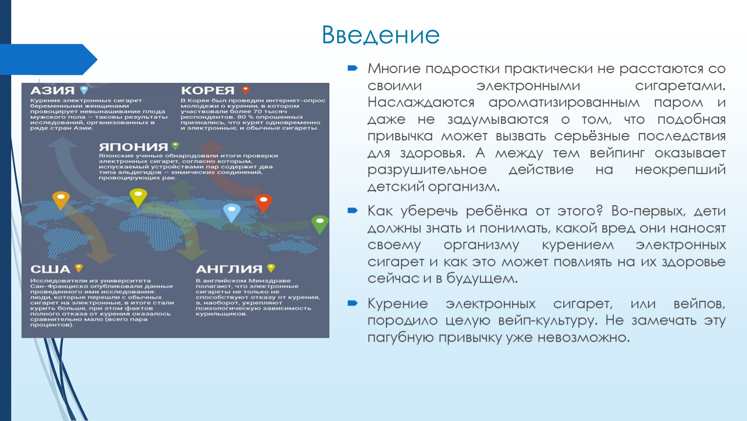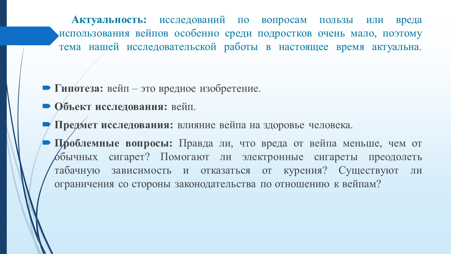 Актуальность: исследований по вопросам пользы или вреда использования вейпов особенно среди подростков очень мало, поэтому тема нашей исследовательской работы в настоящее время актуальна.