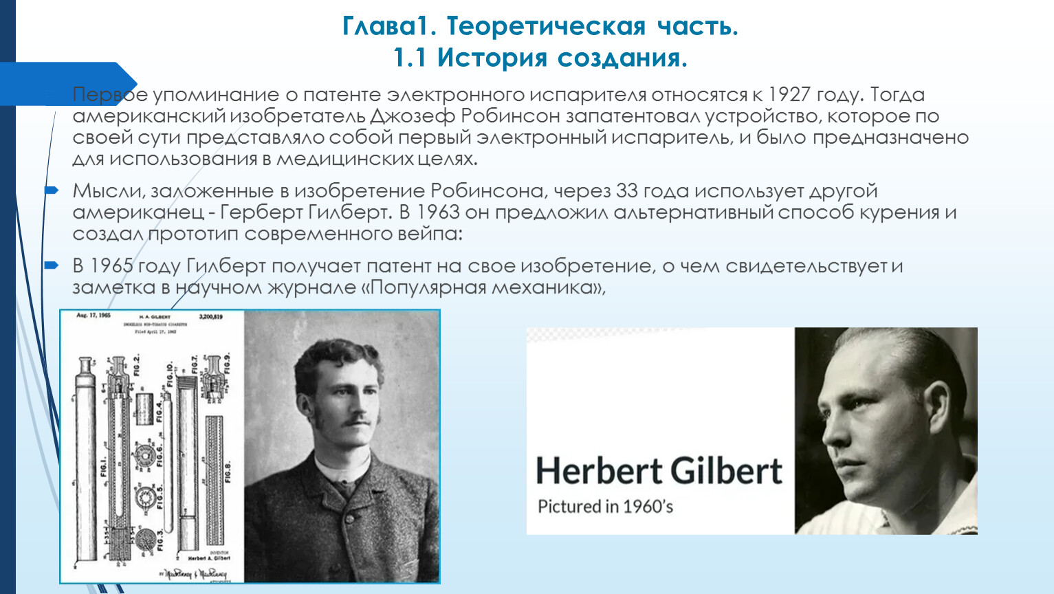 Мысли, заложенные в изобретение Робинсона, через 33 года использует другой американец - Герберт Гилберт. В 1963 он предложил альтернативный способ курения и создал прототип современного вейпа: