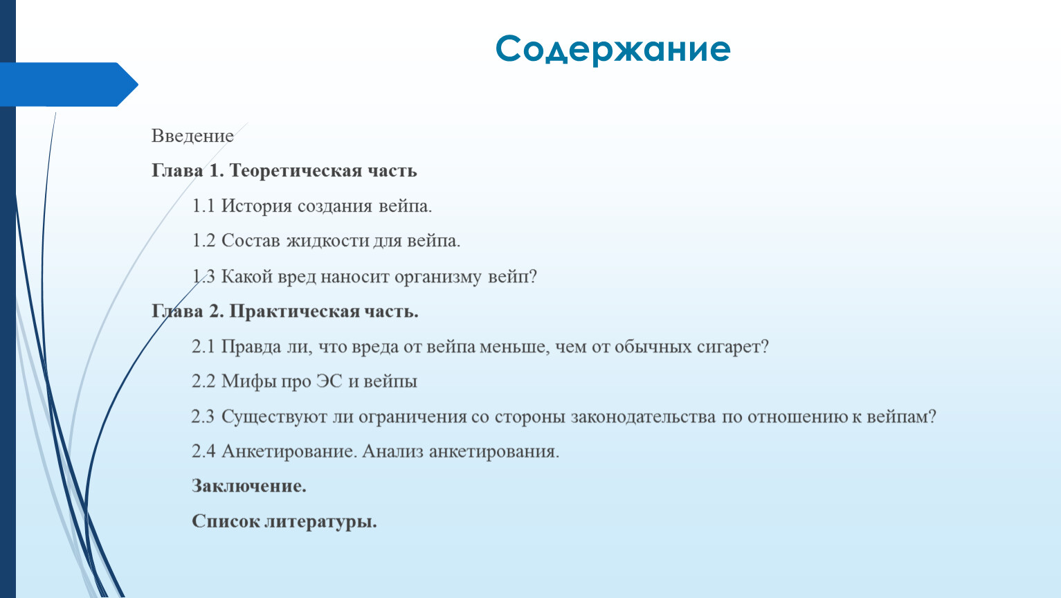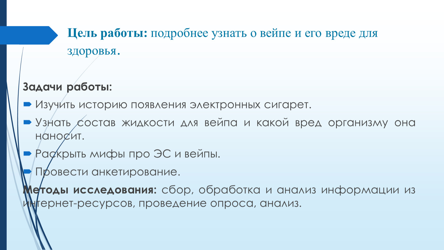 Цель работы: подробнее узнать о вейпе и его вреде для здоровья.