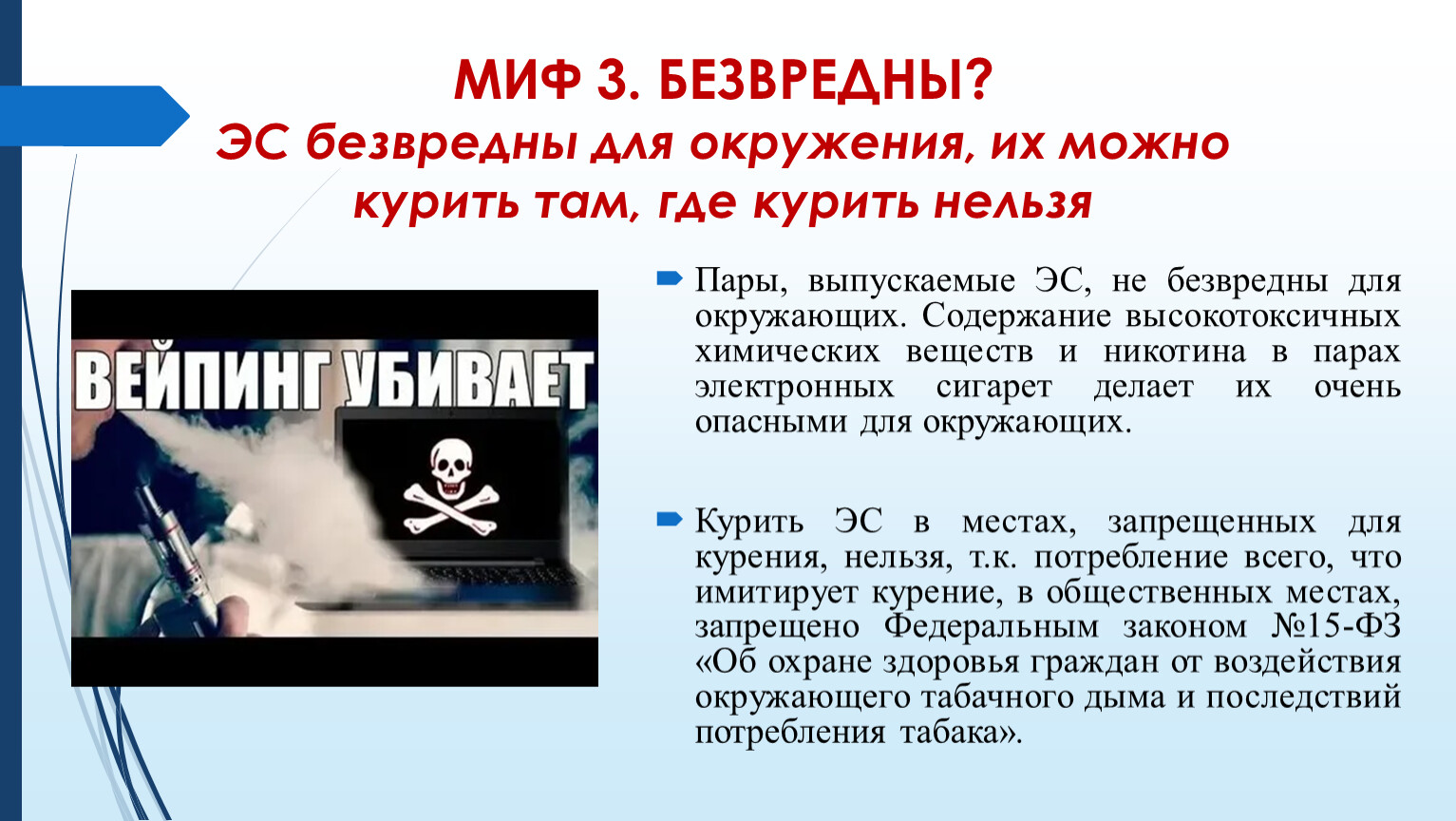 МИФ 3. БЕЗВРЕДНЫ? ЭС безвредны для окружения, их можно курить там, где курить нельзя