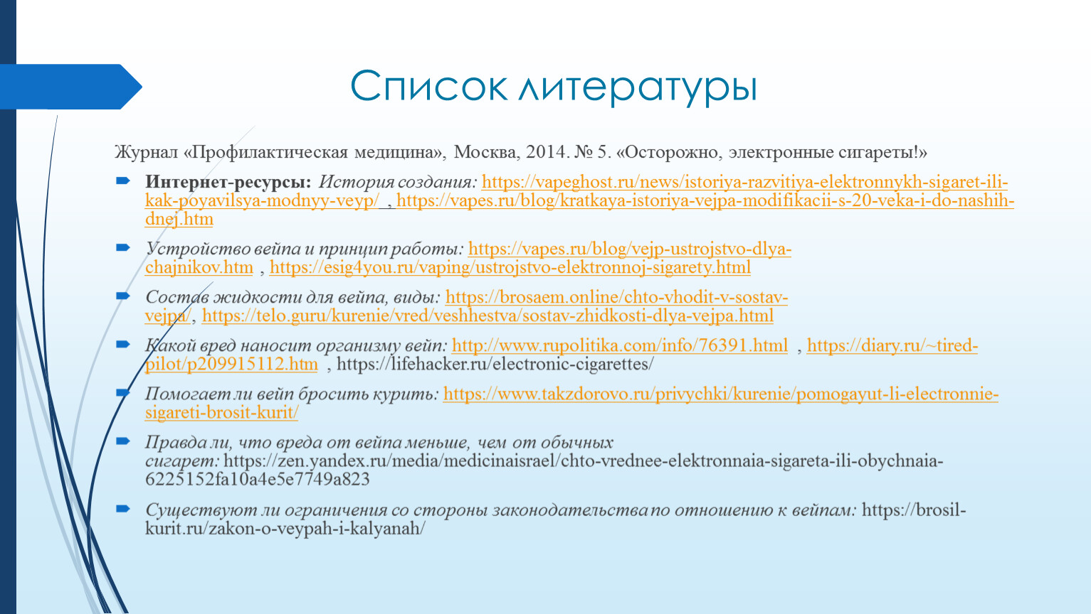 Интернет-ресурсы: История создания: https://vapeghost.ru/news/istoriya-razvitiya-elektronnykh-sigaret-ili-kak-poyavilsya-modnyy-veyp/ , https://vapes.ru/blog/kratkaya-istoriya-vejpa-modifikacii-s-20-veka-i-do-nashih-dnej.htm