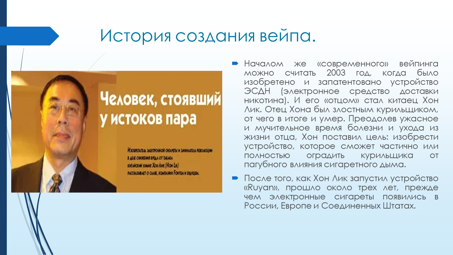 Началом же «современного» вейпинга можно считать 2003 год, когда было изобретено и запатентовано устройство ЭСДН (электронное средство доставки никотина). И его «отцом» стал китаец Хон Лик. Отец Хона был злостным курильщиком, от чего в итоге и умер. Преодолев ужасное и мучительное время болезни и ухода из жизни отца, Хон поставил цель: изобрести устройство, которое сможет частично или полностью оградить курильщика от пагубного влияния сигаретного дыма.