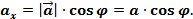 Екіанықтама бар: • 1) вектордыңгеометриялықпроекциясы — вектор; • 2) вектордыңоськетүсіретінпроекциясы — сан. Вектордыңгеометриялықпроекциясы — векторлардыңұштарынантаңдалғаноське перпендикуляр түсіргендепайдаболатын вектор. Вектордыңбасындағы проекция геометриялықпроекцияныңбасымен, ал вектордыңсоңындағы проекция геометриялықпроекцияныңсоңыменсәйкескеледі. Вектордыңоськетүсірілгенпроекциясы — бұлгеометриялық проекция векторыныңұзындығынатең скаляр шама (сан), егер геометриялық проекция мен осьтің бағыты сәйкес келсе; Немесе егер геометриялық проекция мен осьтің бағыты қарама-қарсы болса, геометриялық проекция векторының ұзындығына қарама-қарсы сан. Проекцияны вектордың бастапқы А(x1, y1) және соңғы B (x2, y2) нүктелерінің координаттары арқылы табу ax= x2 - x1 ay= y2 - y1