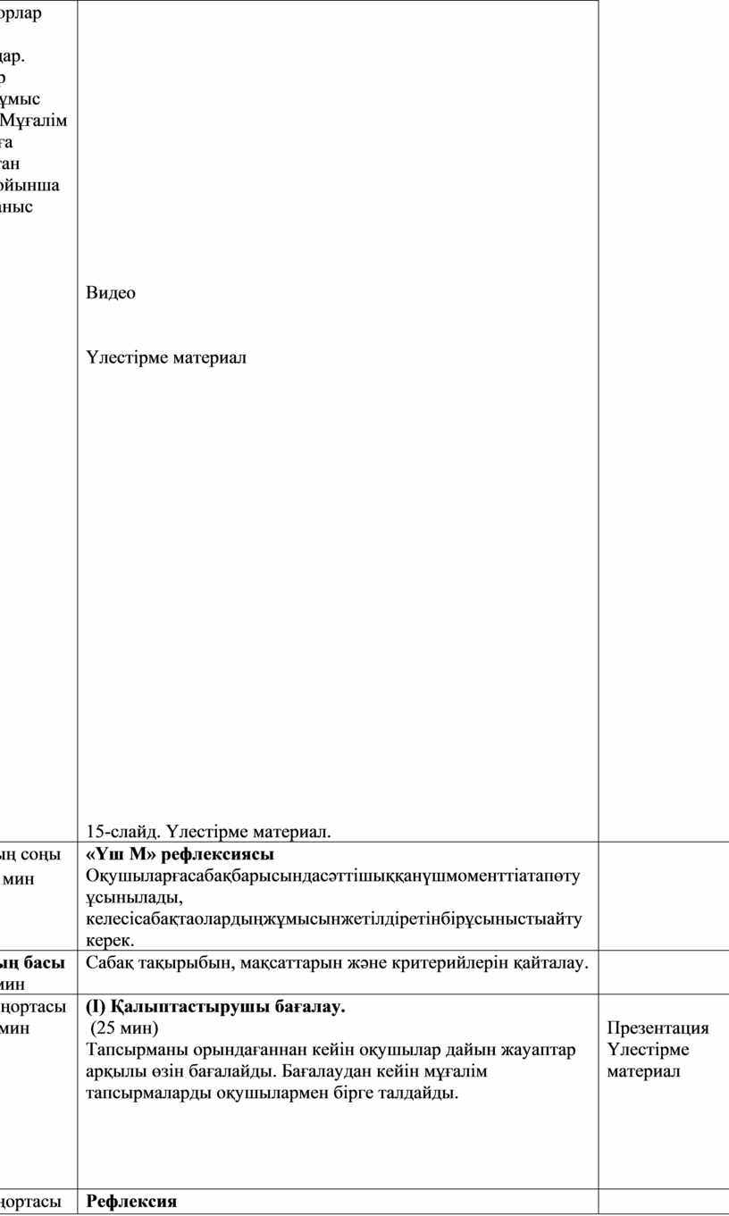 (І) Қалыптастырушы бағалау. (25 мин) Тапсырманы орындағаннан кейін оқушылар дайын жауаптар арқылы өзін бағалайды. Бағалаудан кейін мұғалім тапсырмаларды оқушылармен бірге талдайды. |