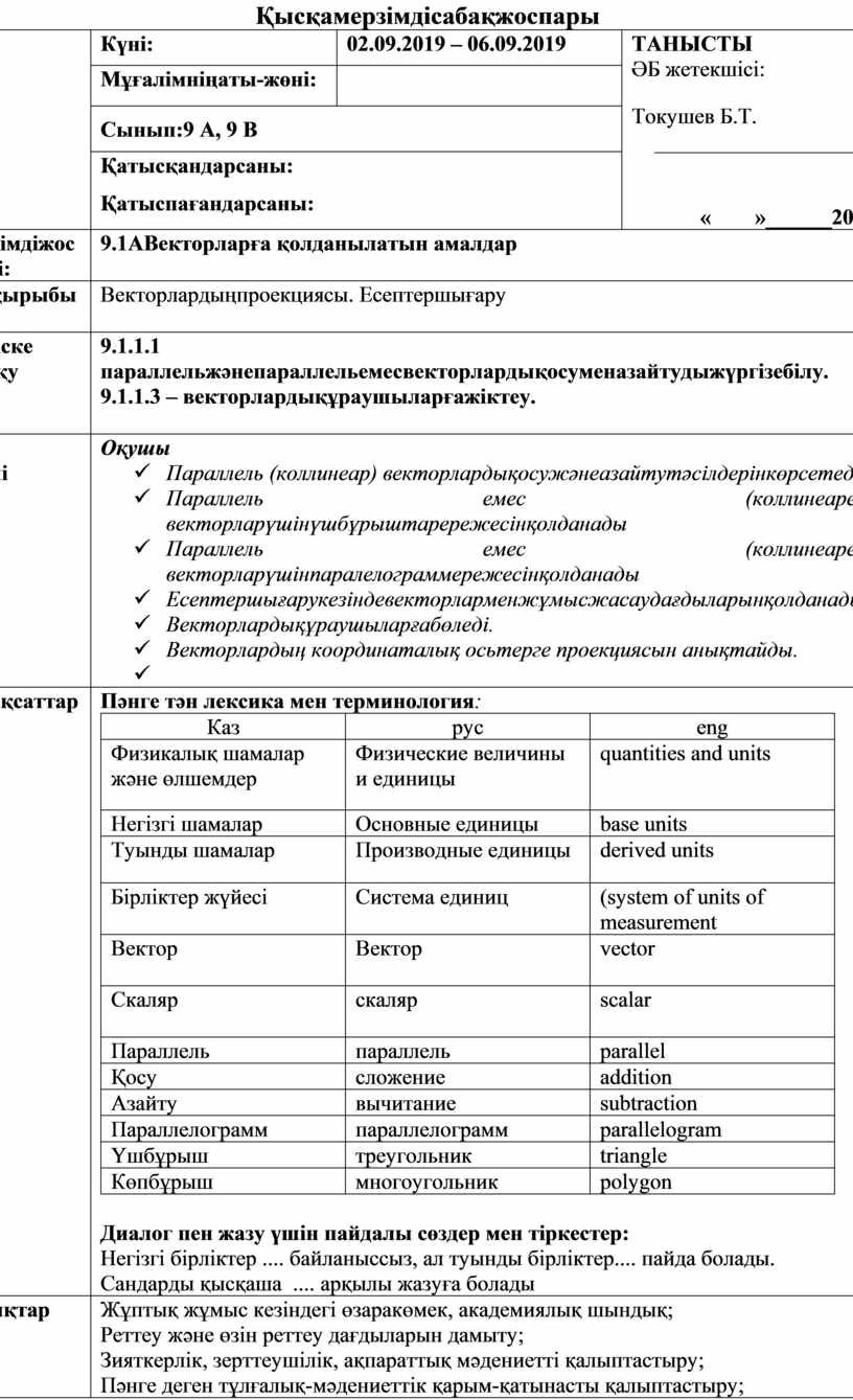 9.1.1.1 - параллельжәнепараллельемесвекторлардықосуменазайтудыжүргізебілу. 9.1.1.3 – векторлардықұраушыларғажіктеу.